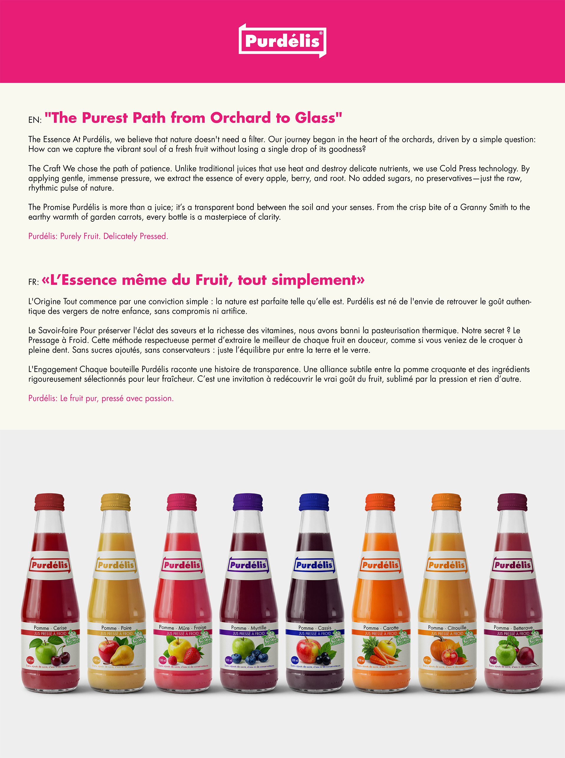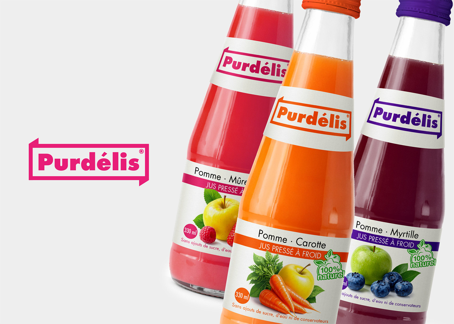 Purdélis is a range of high-quality natural fruit juices at affordable prices. These juices are packaged in a 300-ml glass bottle with a bright label that highlights each taste in color. Country: France 2016